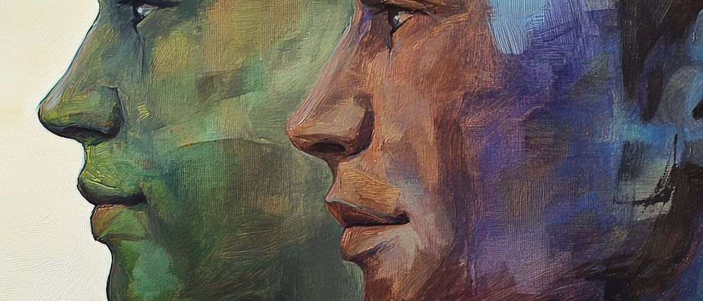 Twee gestileerde profielen in harmonieuze blauw- en groentinten vertellen verhalen van ontmoeting en reflectie. Hun zachte lijnen en interessante kleursamenstelling geven elke kamer een modern tintje. Ideaal voor een woonkamer of een creatief kantoor waar gedachten en ideeën kunnen stromen.