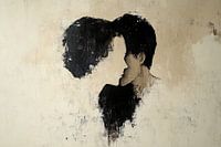 Details: abstract schilderij, gezicht, profiel, samensmelting, modern kunstwerk, intieme sfeer, serene uitstraling, monochroom, gezichtskunst, dubbelportret