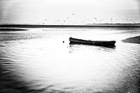 Zwart-wit foto van gezonken stalen bootje die droogvalt tijdens eb op de slikken van de Oosterschelde in Zeeland. Het bootje is begroeid met oesters, aan de horizon vliegen vogels op.