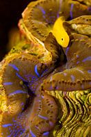 Giant clam (Tridacna maxima) (Okinawae gobiodon) met gele koraal goby