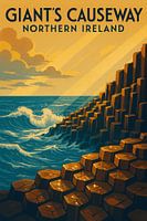 Dit art-decostijl kunstwerk legt de dramatische schoonheid van de Giant's Causeway in Noord-Ierland vast, een van de meest bijzondere natuurwonderen van Europa. Het ontwerp benadrukt de beroemde zeshoekige basaltzuilen terwijl ze afdalen in de verpletterende Atlantische Oceaan, badend in de warme gloed van gouden zonsondergang. Met gestileerde golven en stralende stralen die over de horizon stromen, roept de afbeelding zowel mysterie als tijdloze natuurlijke majesteit op.
