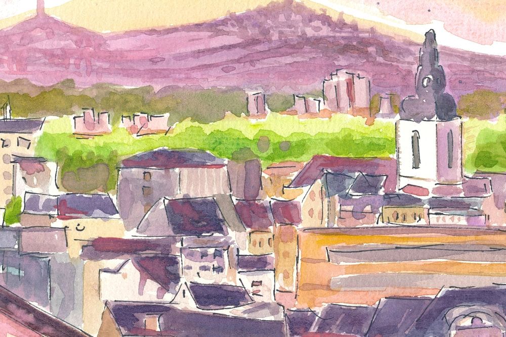 Giessen Hessen Duitsland met zonsondergang over stad en heuvels