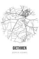 Zwart-witte landkaart, stratenplan of plattegrond van Giethmen. Giethmen is gelegen in de gemeente Ommen, provincie Overijssel. Op de stadskaart zijn alle openbare wegen in Giethmen opgenomen. Verder is de kaart voorzien van de coördinaten van het centrum van Giethmen.