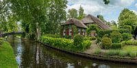 Panorama foto van Giethoorn in Nederland tijdens een rustige lentedag, geschoten bij een van de mooiste huizen met de rode luikjes