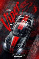 Een agressieve Dodge Viper SRT, gefotografeerd vanuit een hoge hoek, omringd door een woeste rode slangengrafiek. De zwarte carrosserie met dubbele rode racestrepen straalt Amerikaanse kracht uit en combineert 'Street and Racing Technology' met een dodelijke, roofzuchtige uitstraling.