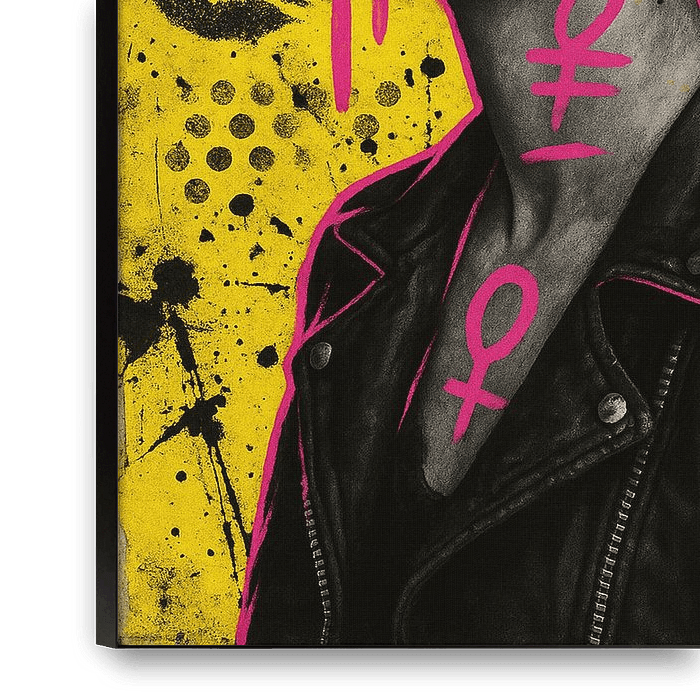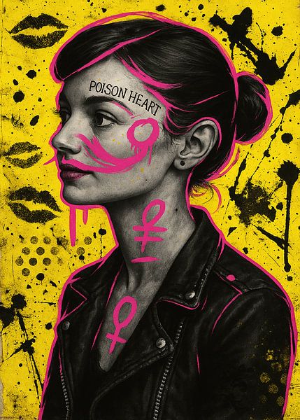 Een krachtig street art-portret dat vrouwelijke energie, rebellie en kwetsbaarheid combineert.