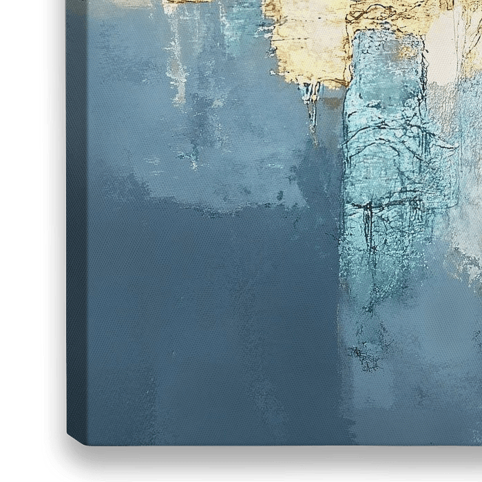 Gilded Reflections in Blue - Dit abstracte schilderij toont een spel van texturen en kleurlagen, met prominente tinten van blauw en goud die een diepzinnige en visueel rijke ervaring creëren.