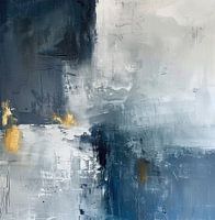 Gilded Shadows on Blue - Dit abstracte schilderij toont een dynamisch samenspel van diepblauwe, grijze en witte tinten met opzettelijke uitspattingen van goud die zowel contrast als interessante focuspunten creëren.