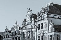 Zwart-witfoto van gildehuizen op de Grote Markt, in het centrum het Maison de L'Arbre d'Or, in het stadscentrum van Brussel, België