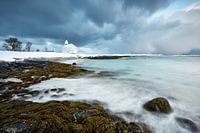 Gimsoy-kerk in de winterstorm - Prachtige Lofoten van Rolf Schnepp