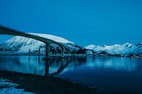 Gimsøystraumenbrug in de Sydalspollenfjord tijdens zonsondergang op de Lofoten in de winter. De brug overspant de zeestraat Gimsøystraumen tussen de eilanden Austvågøya en Gimsøy.