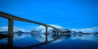 Gimsøystraumenbrug in de Sydalspollen Fjord tijdens zonsondergang op de Lofoten tijdens een koude winterdag met besneeuwde bergen op de achtergrond.