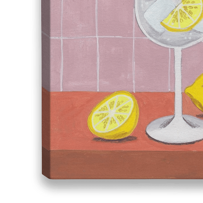 Een vrolijke illustratie met een zomerse gin & tonic cocktail. Citroenen en een geel rietje tegen roze betegelde muur op een terracotta oranje aarde tinten tafelkleed. Een zomers stilleven tafereel om je keuken of eetkamer mee op de vrolijken! Origineel acrylverf op papier.