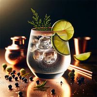 De gin & tonic, een tijdloze mix van gin, tonic en vers limoensap, wordt in een nieuw licht geplaatst door de moderne kunstvorm. Het sprankelende lichtspel op het oppervlak van de drank en het aangrenzende koperen keukengerei voegt een warme, uitnodigende sfeer toe.