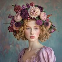Als bijzonder detail draagt de vrouw een creatief samengesteld hoofddeksel van bloemen. Verschillende bloemsoorten zijn gerangschikt bovenop haar hoofd. Dit unieke hoofddeksel voegt een speelse en kleurrijke dimensie toe aan het kunstwerk.
