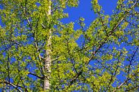 Ginkgo (Ginkgo biloba) in mei voor de blauwe hemel