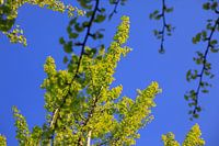 Ginkgo (Ginkgo biloba) in mei voor de blauwe hemel