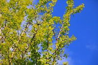 Ginkgo (Ginkgo biloba) in mei voor de blauwe hemel