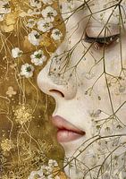 Gipskruid | Whispers of Gold - Dit bloemenschilderij toont een sereen portret versierd met subtiele, witte gipskruidbloemen, ingebed in een gouden textuur die elegantie en rust uitstraalt.