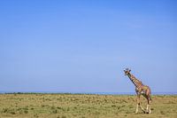 Zeer weids landschap van groene korte savanne in de Masai Mara in Kenia. De horizon ligt laag in de foto, de rest is blauwe lucht. Rechtsvoor zien we een giraffe die loopt en ons aankijkt. Hierdoor krijgt de foto meer perspectief en zien we pas echt hoe weids het landschap is.