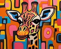 Giraffe Beeld - Op dit dieren schilderij zie je een giraffe met een opvallend kleurenschema, gekenmerkt door felle kleuren zoals oranje, roze en blauw, die samen met de zwart omlijnde vormen een speelse uitstraling geven.