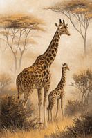 Dit schilderij toont een majestueuze giraffe en haar jong terwijl ze rustig door de savanne wandelen. De gedempte, warme aardetinten van de giraffen passen perfect bij de zachte achtergrond van mistige graslanden en verspreide acaciabomen. De grootse schoonheid van de giraffen wordt benadrukt door de verfijnde texturen van hun vacht en…