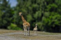 Ontroerend moment: moeder giraf en haar kleine baby tegen een weelderig groene achtergrond. Perfecte scherpte, warme Afrikaanse sfeer en emotionele connectie.