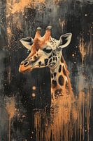 Dit expressieve kunstwerk toont het sierlijke hoofd van een giraffe, prachtig weergegeven met rijke details tegen een dramatische, donkere achtergrond. De gouden en oranje verfspetters creëren een speels en levendig contrast, waardoor het beeld een moderne en artistieke flair krijgt. De combinatie van realisme en abstractie maakt dit…