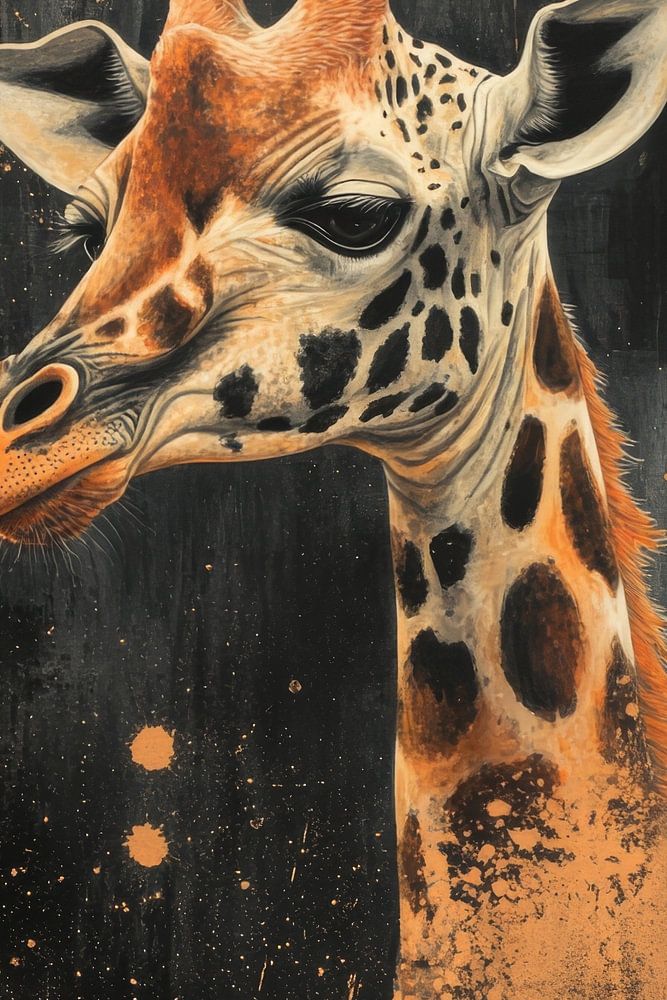 Dit expressieve kunstwerk toont het sierlijke hoofd van een giraffe, prachtig weergegeven met rijke details tegen een dramatische, donkere achtergrond. De gouden en oranje verfspetters creëren een speels en levendig contrast, waardoor het beeld een moderne en artistieke flair krijgt. De combinatie van realisme en abstractie maakt dit schilderij een perfecte aanvulling voor een eigentijds interieur, waar het een krachtige blikvanger vormt.