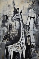 Een giraffe rijst majestueus op te midden van de stedelijke chaos, zijn silhouet glinsterend in elegant wit. De ruwe, monochrome achtergrond contrasteert met de sierlijke vormen van zijn lichaam en zijn opvallende vlekken, die zowel aan kunst als aan de natuur doen denken. Een fascinerend samenspel van elegantie en een melancholische stemming doordringt het landschap.