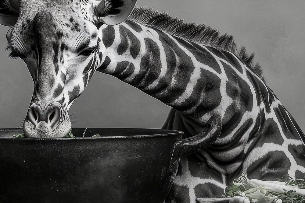 Een speelse giraffe die nieuwsgierig over de rand van een grote kookpot gluurt, brengt onmiddellijk vreugde en afwisseling in elke kamer. Omringd door verse ingrediënten en een vleugje magie wordt de keuken een creatief centrum. Dit fascinerende beeld inspireert tot gastronomische avonturen en geeft de kamer een unieke charme.