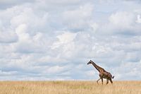 Giraffe loopt door het gras onder een dramatische wolkenlucht in de Masaai Mara in Afrika