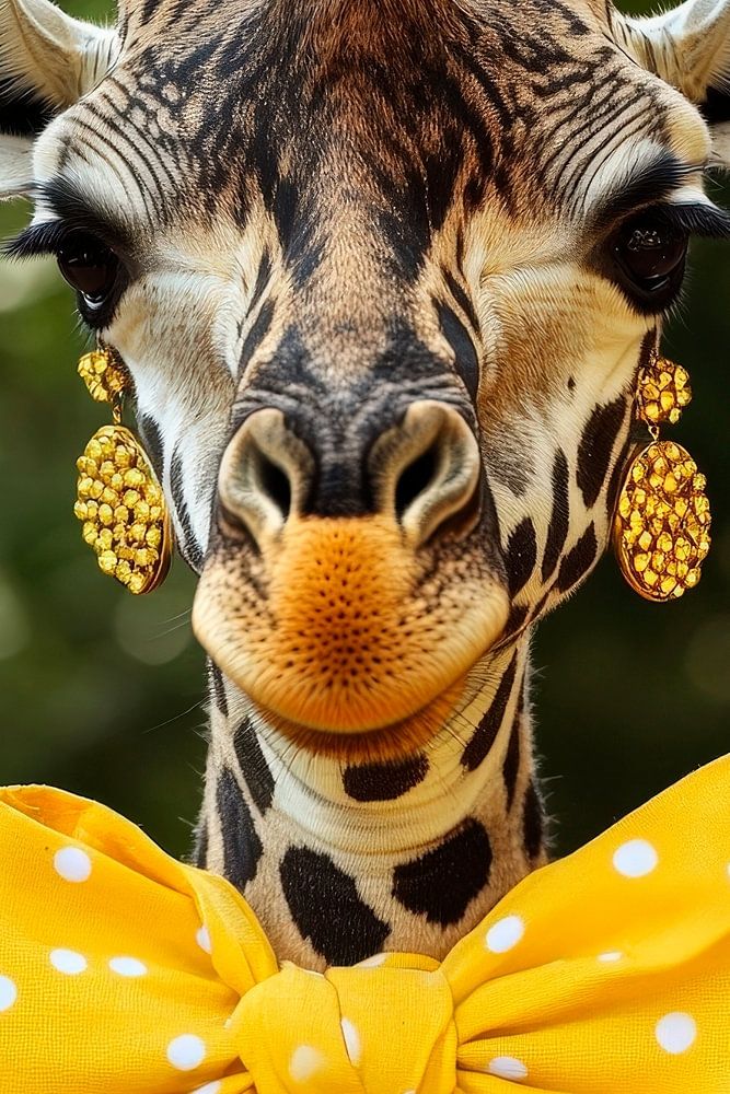 Een charmant, vrolijk wezen schittert met zijn felgele accessoires en glinsterende oorbellen. De speelse strik voegt een vleugje elegantie en plezier toe aan deze giraffe. Dit beeld is ideaal voor in de woonkamer, brengt een glimlach en levensvreugde in elke woonruimte en zal zeker een gespreksonderwerp zijn onder gasten.