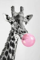 Een creatieve zwart-wit opname van een giraffe die een roze ballon in zijn bek houdt. Indrukwekkend, speels en uniek.