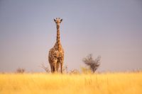 Giraffe staand op savanne. De foto werd 's ochtends vroeg gemaakt en heeft een warme kleur. De foto werd gemaakt in het droge seizoen in Namibië en het gras op de savanne is geel van kleur. De foto is een vooraanzicht en de Giraffe kijkt recht in de camera