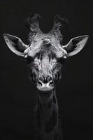 Een krachtige zwart-wit portretfoto van een giraffe, die de majestueuze schoonheid en intense blik van dit prachtige dier vastlegt. De donkere achtergrond versterkt het contrast en de focus op de giraffe, waardoor een gevoel van mysterie en intrige ontstaat. Dit kunstwerk is een tijdloze toevoeging aan elke moderne inrichting en zal zeker een gespreksstarter zijn.