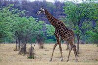 Mooie donkere vlekken van de giraffe contrasteren mooi met het landschap.