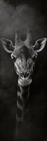 Het majestueuze gezicht van een giraffe rijst op in een mystiek spel van licht en schaduw, met een even fascinerende als angstaanjagende blik. De contrastrijke afbeelding trekt ieders aandacht en voegt een vleugje duivelsheid en elegantie toe aan een creatieve woonkamer of stijlvolle werkplek.