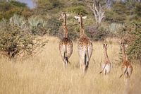 Vier giraffen, pa, ma en twee kinderen, samen aan de wandel over de savanne van de Caprivi strook, Namibië. Het is een bijna komiek beeld om de vier giraffen zo te zien lopen, met de staarten van de twee jonge giraffen dezelfde kant op zwaaiend. Beeld roept associaties op met gezinsleven en familiewaarden.