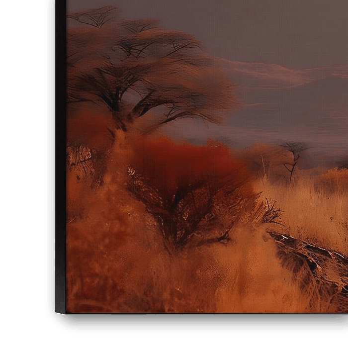 Op de savanne, tijdens het avondrood, zie je elegante giraffen langzaam lopen. Hun gracieuze silhouetten steken af tegen de warme tinten van de ondergaande zon. Ze bewegen sierlijk over het uitgestrekte landschap, hun nekken reiken naar de laatste blaadjes. Een betoverende scène die de schoonheid van de natuur op een serene manier weergeeft.