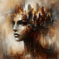 Dit abstracte werk met goud- en bruintinten combineert de gracieuze vormen van een vrouw met de dynamiek van een stad / skyline. De warme gouden tinten symboliseren zowel luxe als innerlijke kracht, terwijl de bruine tinten in de stad / skyline vooruitgang en bedrijvigheid weerspiegelen. De compositie biedt een unieke balans tussen natuur en stedelijke ontwikkeling, waarbij de vrouwelijke gestalte en de strakke lijnen van de gebouwen harmonieus samenkomen. De artistieke abstractie prikkelt de verbeelding en nodigt de kijker uit tot introspectie. Dit tijdloze kunstwerk straalt emoties van kracht, vrijheid en persoonlijke groei uit.