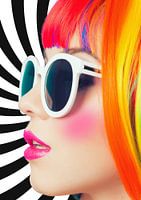 In dit unieke ontwerp hebben haar haren alle kleuren van de regenboorg, is de rouge dik aangezet en is de achtergrond in grafische strepen in zwart wit, zoals je in de jaren tachtig op veel afbeeldingen zou kunnen zien.