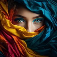 Een jonge dame met prachtige ogen die je kunt zien door de gekleurde sjaal.