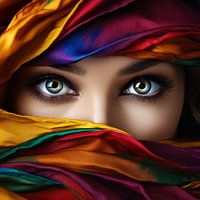 Een jonge dame met prachtige ogen die je kunt zien door de gekleurde sjaal.