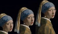 Het meisje met de parel van de schilder Johannes Vermeer afgebeeld als puber, tiener en tot volwassen vrouw. Als pubertje zie je al haar schoonheid en draagt ze een bescheiden parel. Als tiener heeft ze een grotere zilveren parel in haar oor en als volwassen vrouw heeft ze zichzelf versierd met een goudkleurige parel, een gouden neusring en een hippe bril. Kunst met een knipoog, van oude meesters en nieuwe meesters.