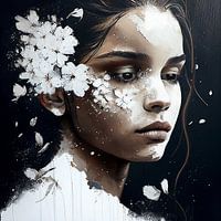 Abstract en gedetailleerd schilderij van een beeldschoon meisje met witte bloemen. Acrylverf en palletmes techniek. Wit en beige op een mooie contrasterende donkere achtergrond. Passend bij veel trends, waaronder Beige & Organic. Subtiel en verfijnd.