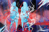 Twee sterke zelfverzekerde vrouwen in een kleurige dynamische omgeving met rood, wit, paars, zwart en blauw. Een krachtig en modern werk dat een apart kleurrijk accent geeft in het interieur.