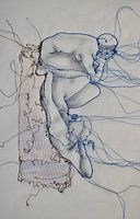 Een figuratief werk van blauw & bruin draad op textiel. Gebaseerd op het werk van Egon Schiele.