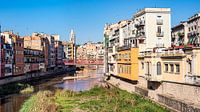 Riu Onyar rivieroever met gevels en kathedraal van Girona in Catalonië Spanje