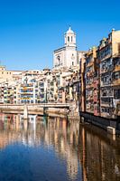 Rivieroever Riu Onyar met huisgevels en oude stadskathedraal Girona in Catalonië Spanje